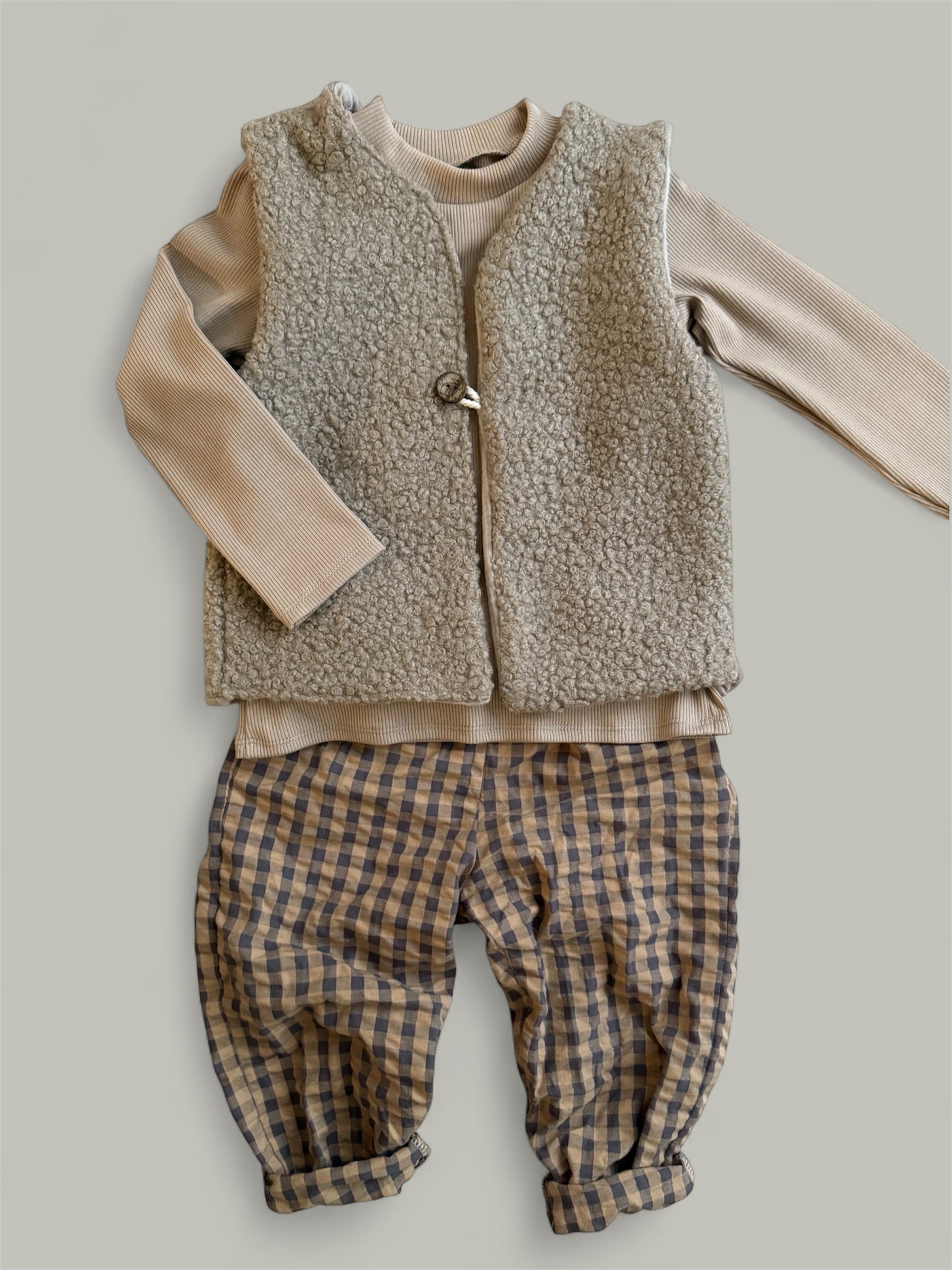 Perfekt kombinierbar mit der Karo-Hose und dem Rippenjersey-Longsleeve – ein zeitloses Outfit zum Wohlfühlen, Spielen und Entdecken.